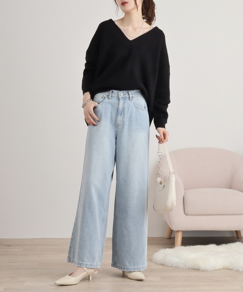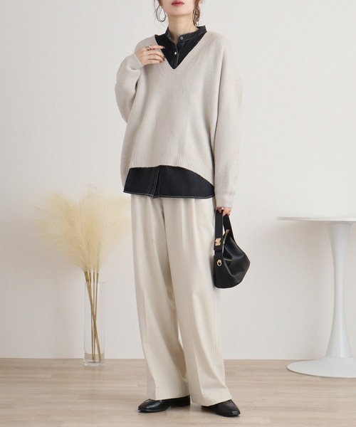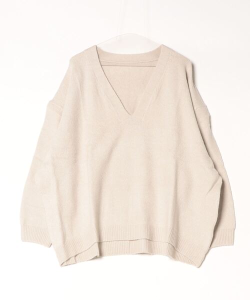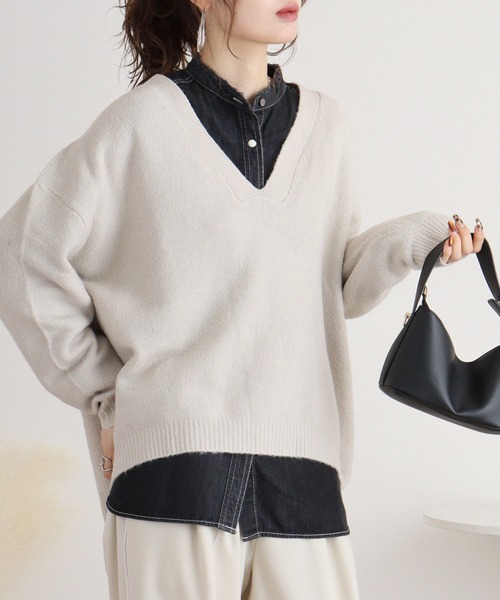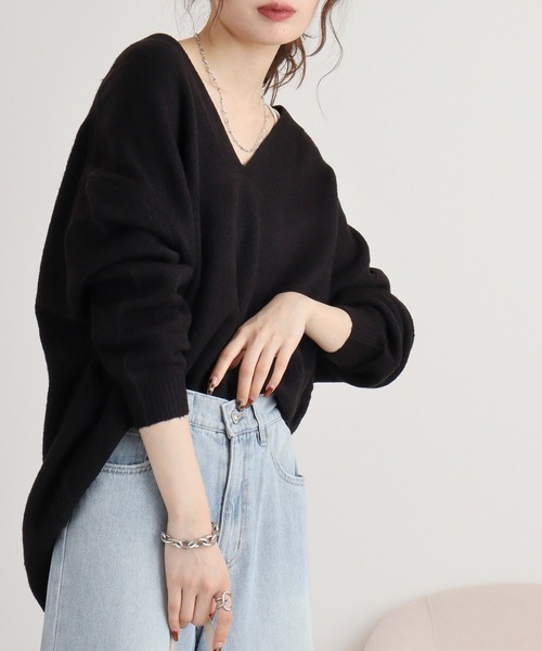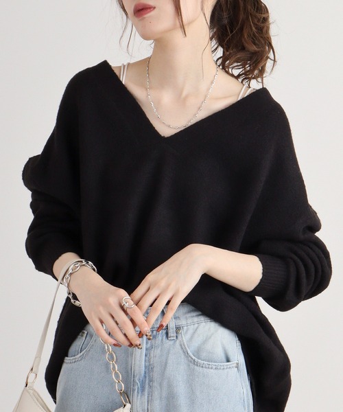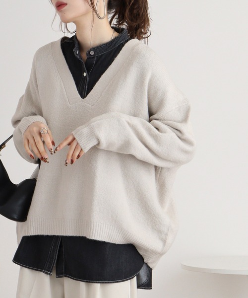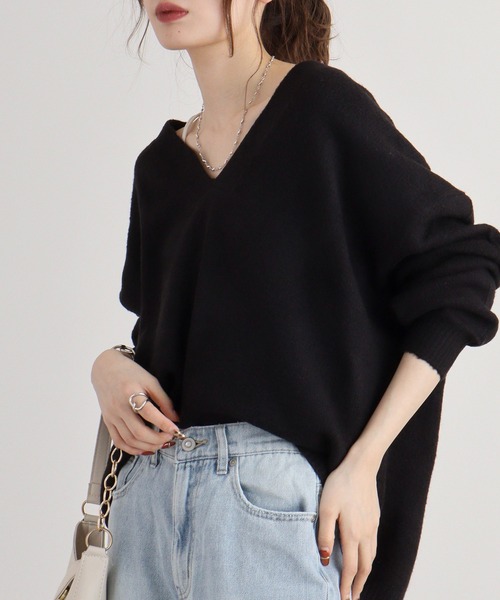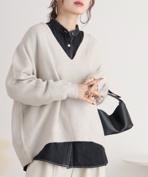 ディープVネックセーター、キーネックデザインにより鎖骨見せが魅力的。ゆるやかなシルエットがリラックス感を演出し、カジュアルながらも女性らしい印象を与えます。柔らかな素材感で快適な着心地を提供し、日常の着こなしからちょっとしたお出かけまで、幅広いスタイリングに対応するスタイリッシュなアイテムです。